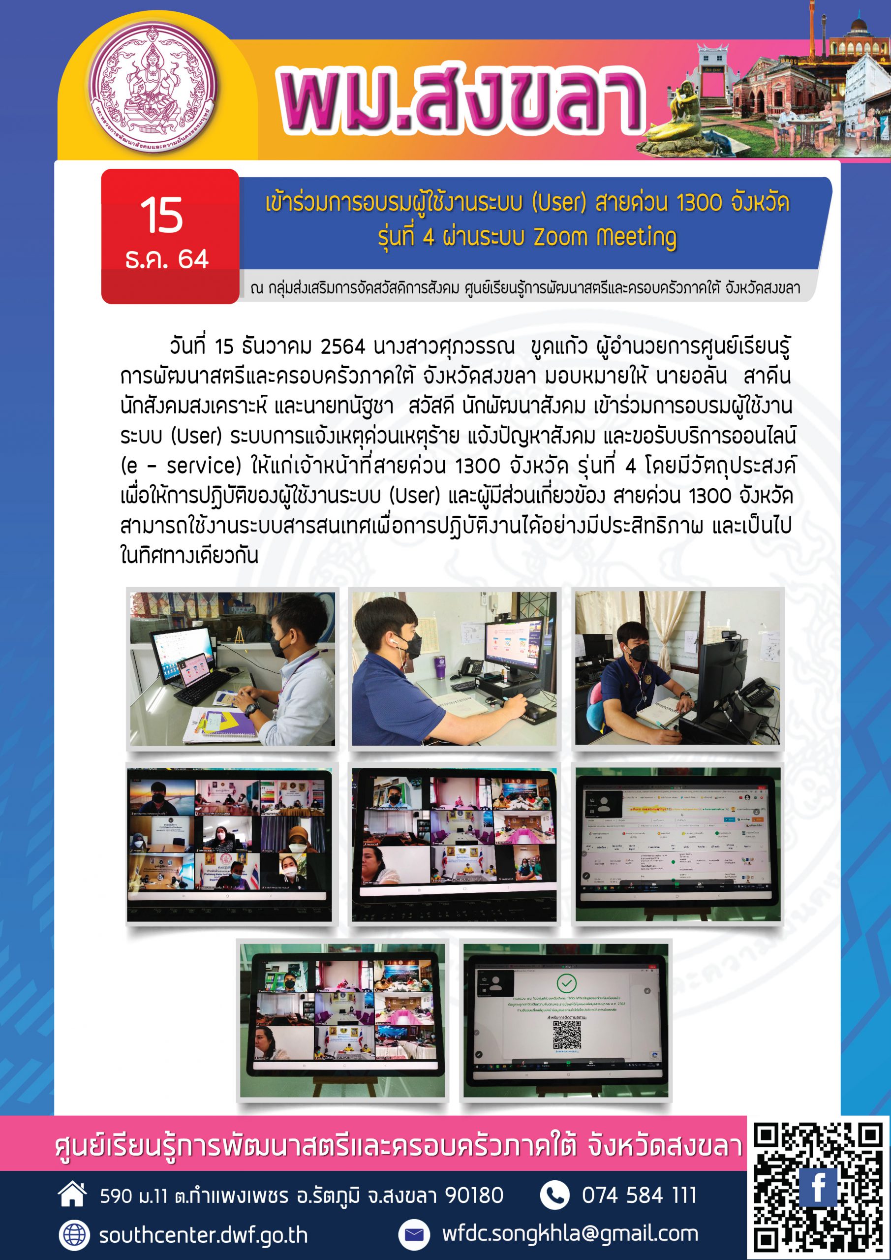 PR-เข้าร่วมการอบรมผู้ใช้งานระบบ (User) สายด่วน 1300 จังหวัด รุ่นที่ 4 ผ่านระบบ Zoom Meeting ณ กลุ่มส่งเสริมการจัดสวัสดิการสังคม ศูนย์เรียนรู้การพัฒนาสตรีและครอบครัวภาคใต้ จังหวัดสงขลา